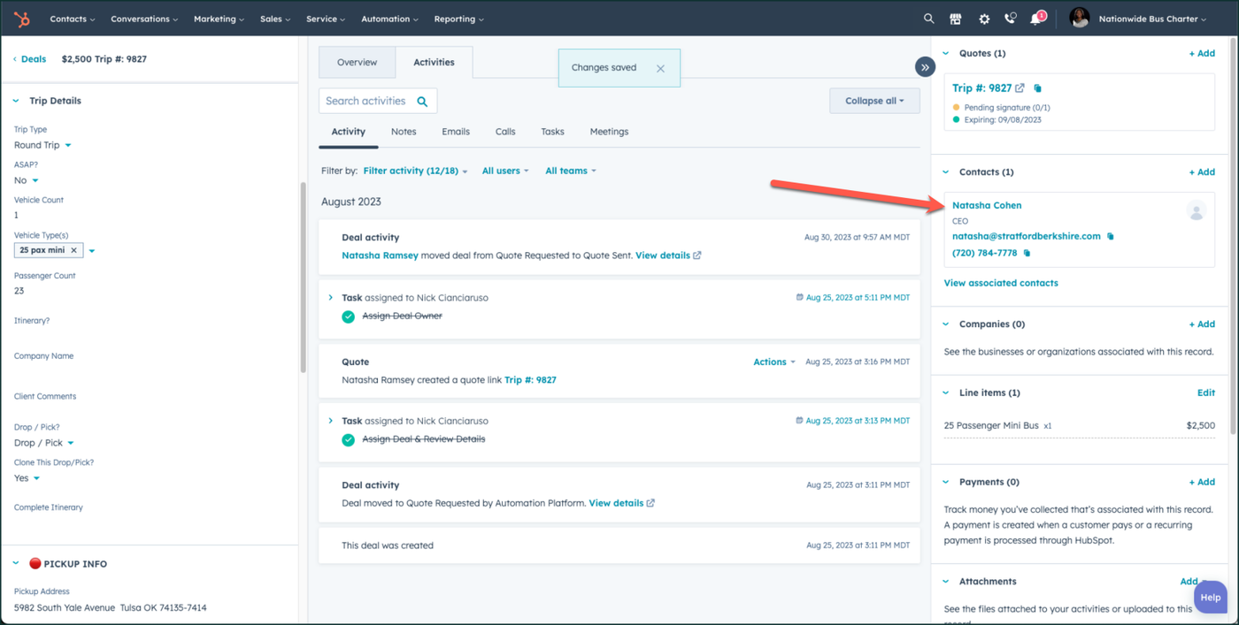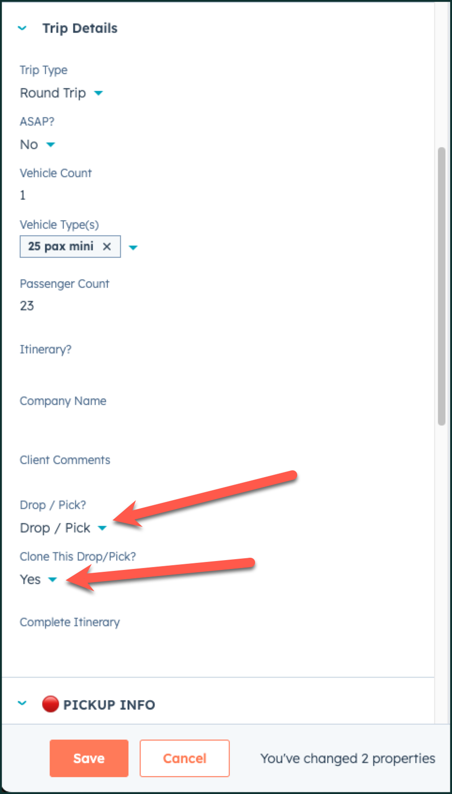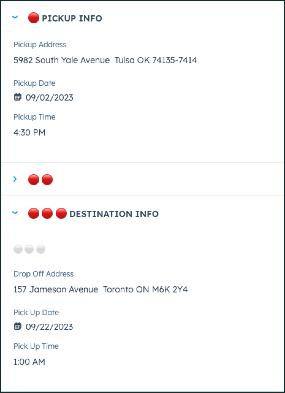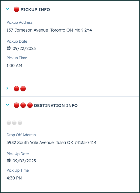 On the left side of the screen, make sure that the Trip Details section is completed and the 🔴 PICKUP INFO and 🔴🔴🔴DESTINATION INFO details are completed for the Drop / Pick. Make sure you have also created a quote for this customer, and have published it.