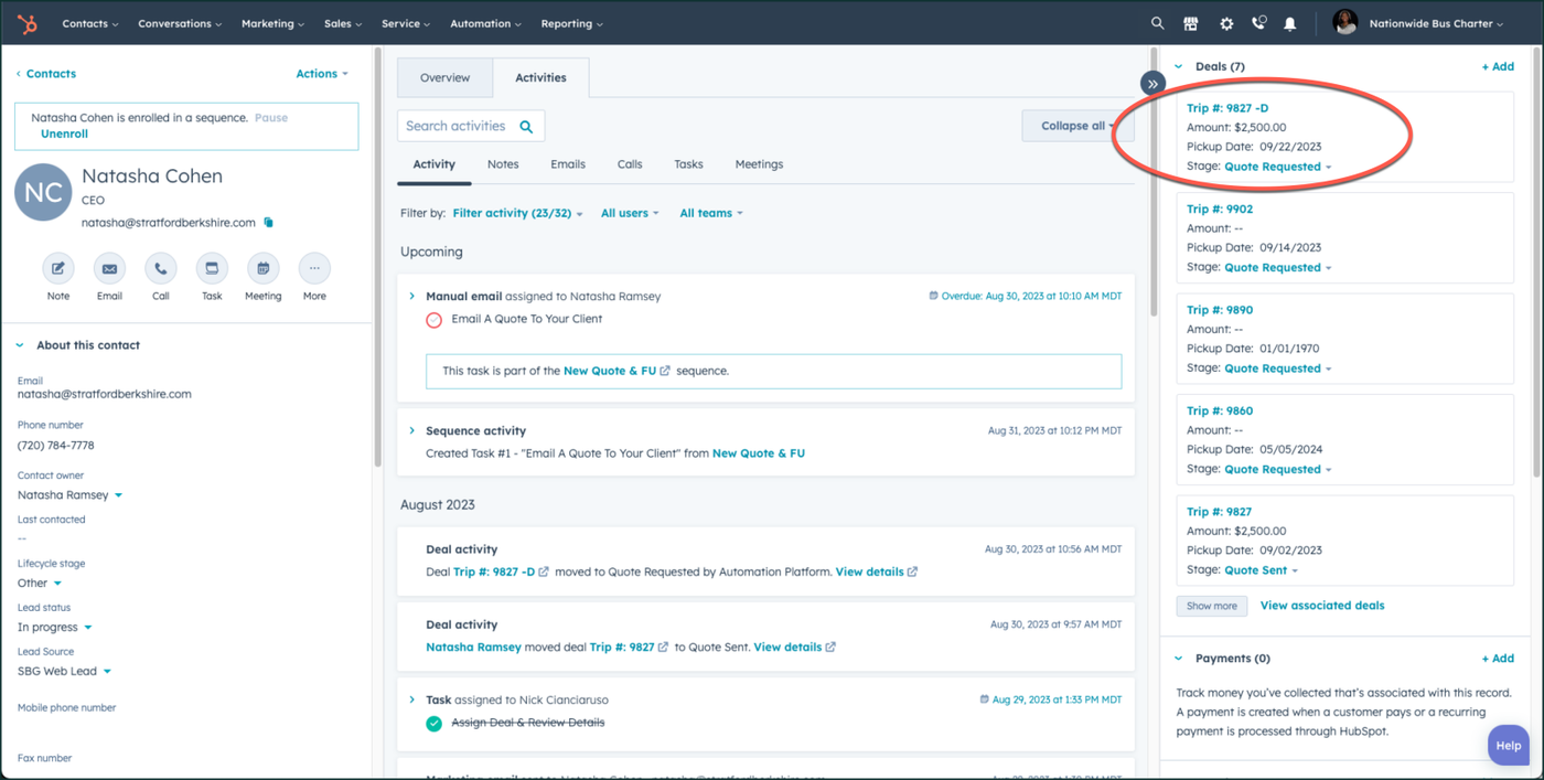 On the right side of the contact screen, you will now see a new trip has been created for the cloned deal. This is indicated by a -D (for duplicated) at the end of it. Click on that trip.