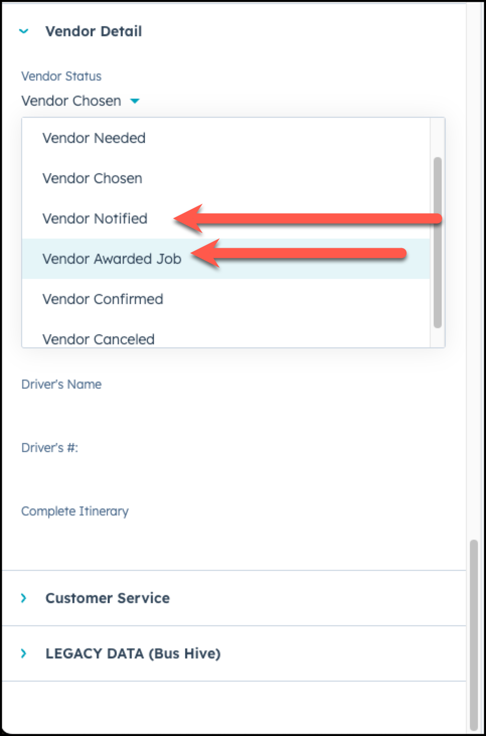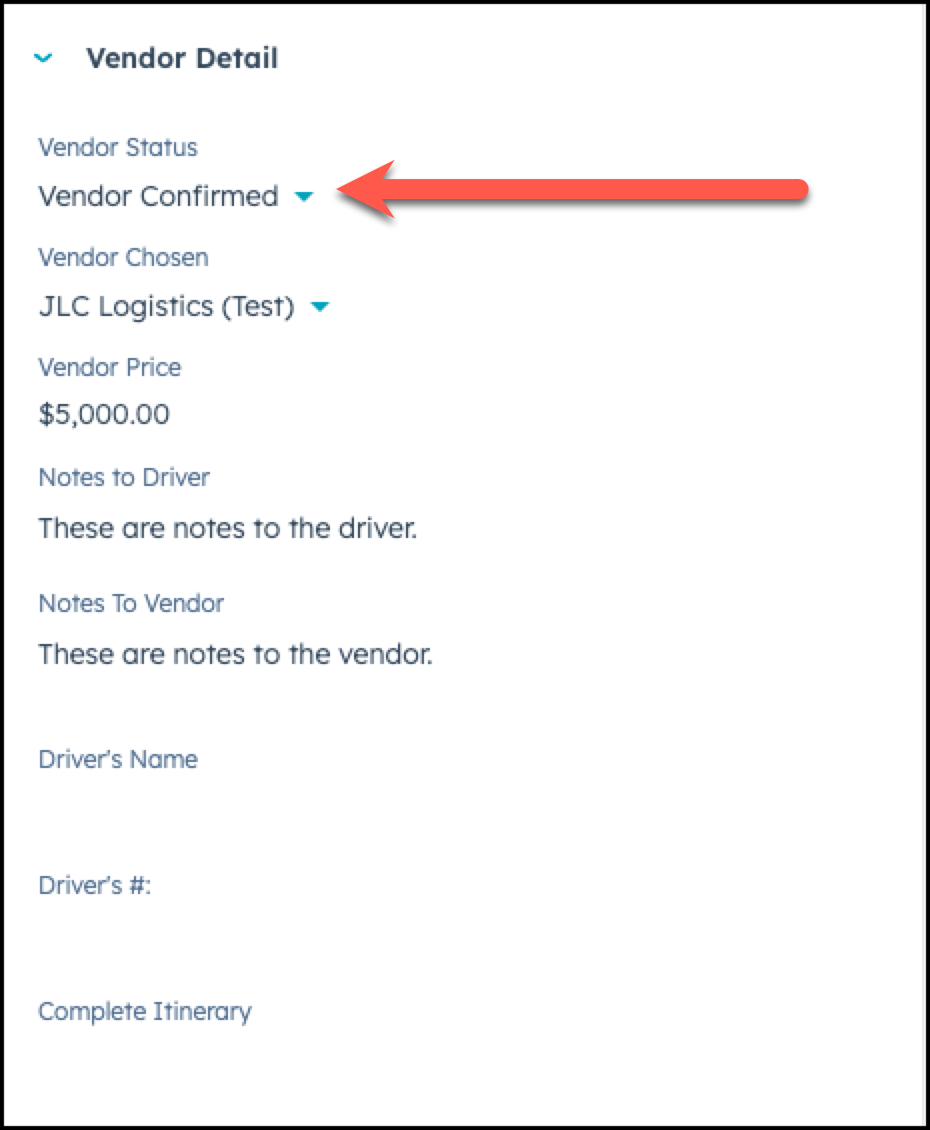 On the left side of your deal, scroll to the Vendor Detail section and under the Vendor Status option, choose Vendor Notified or Vendor Awarded Job.