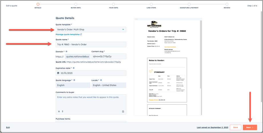 Choose the Vendor's Order Quote template, and make sure that all areas of the quote are updated, including: