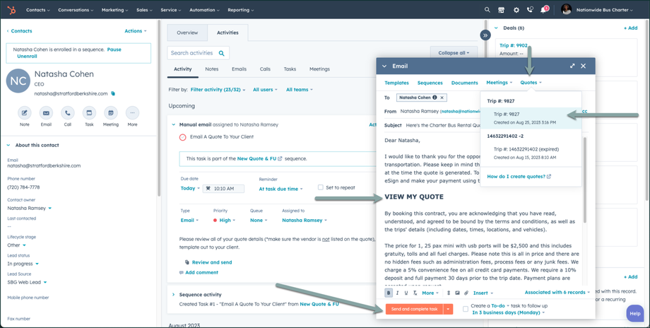 Proceed forward with modifying your email to send the quote to the customer. You will know you are sending it through the sequence because instead of the word "send", it will now show Send and Complete Task.