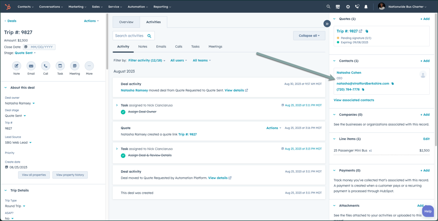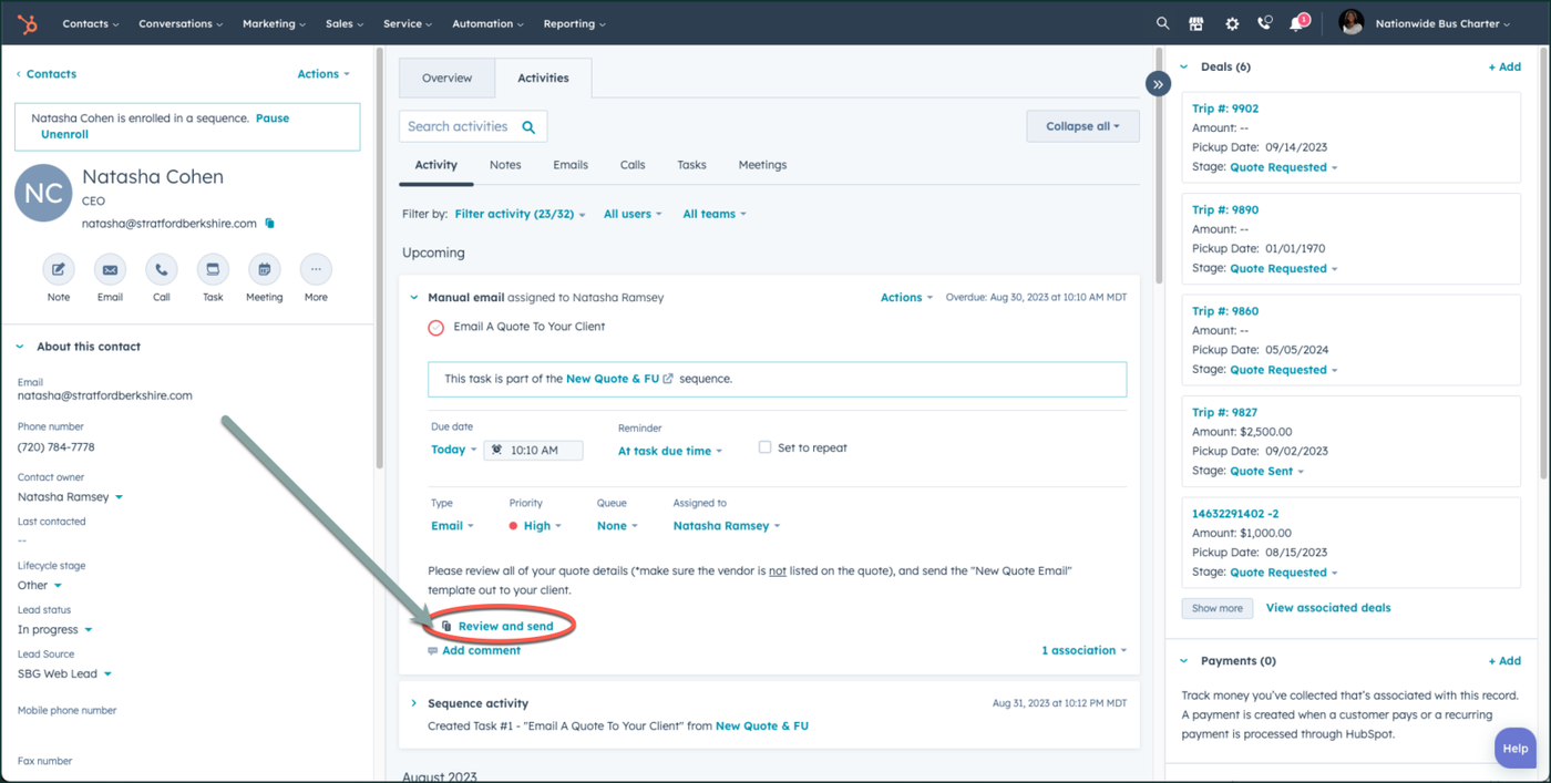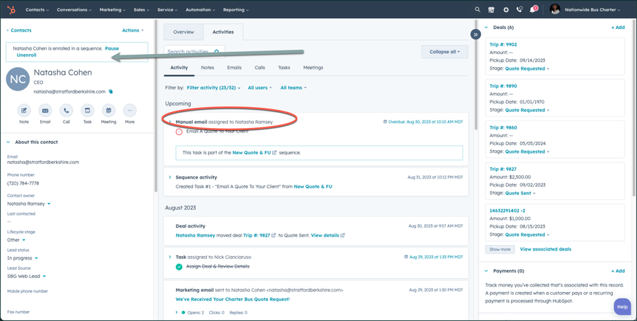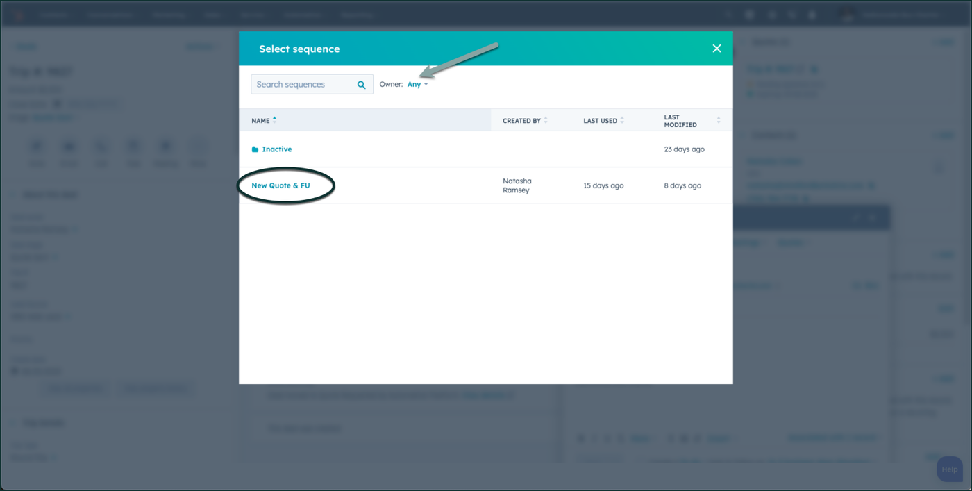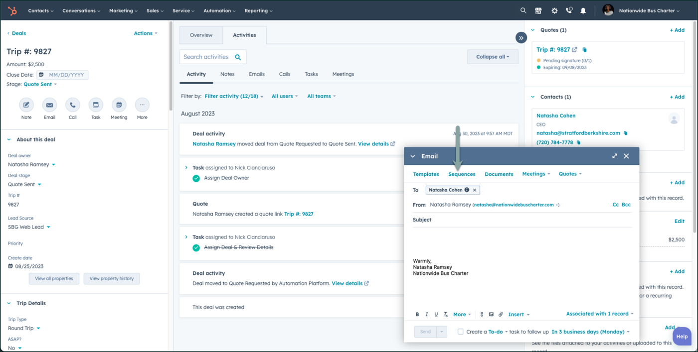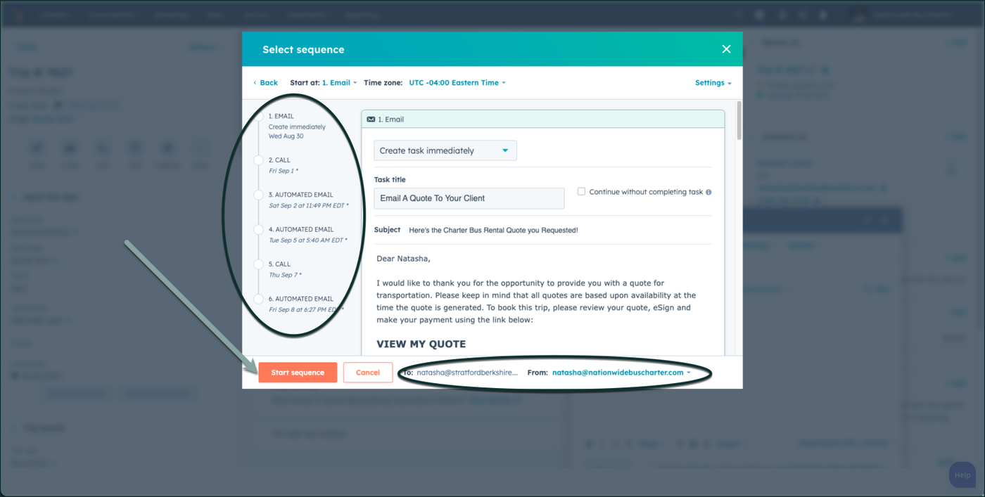 Click on the New Quote & FU sequence. Make sure that the owner view is shown as "Any" to see all sequences created for Nationwide Bus Charter. Make sure that you have all details of the trip completed, so that there are no errors. You can then click on Start Sequence to enroll that contact in a sequence.
