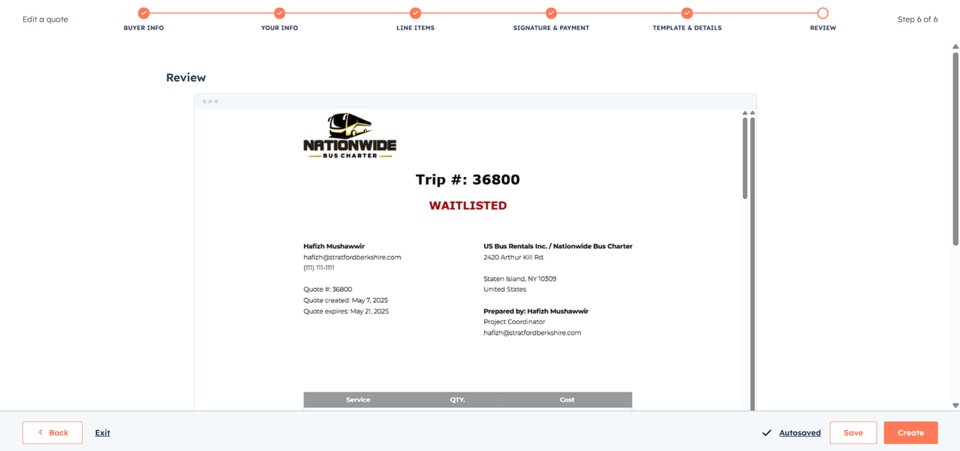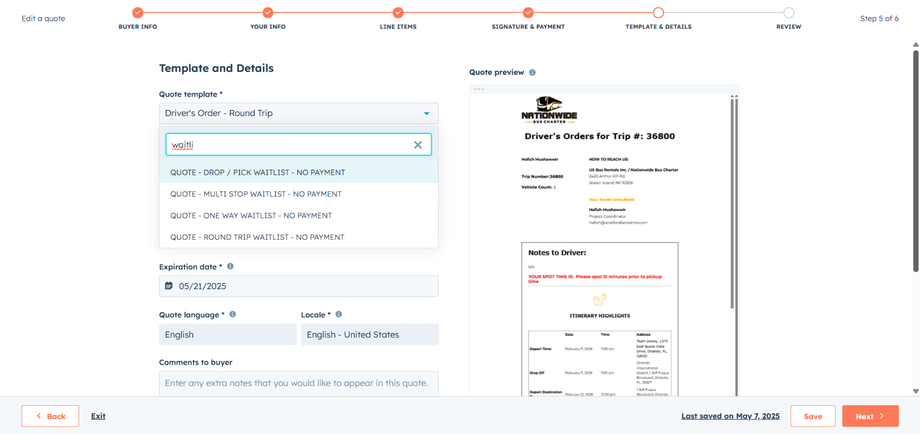 Proceed with drafting your one-way, roundtrip, overnight, shuttle, or multi stop trip as usual. Once you reach the Template & Details section, under the Quote Template please choose the correct Waitlist template that corresponds with the Trip Type.