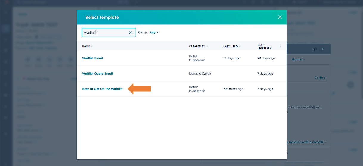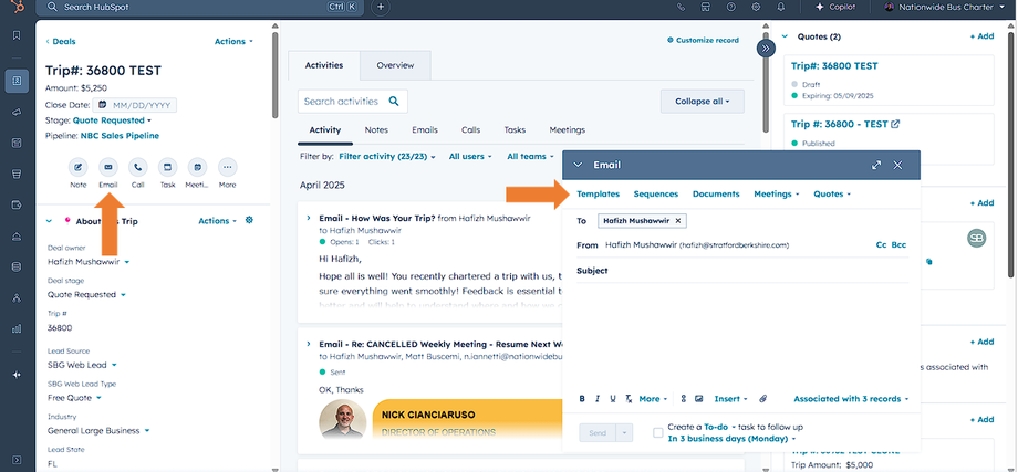 Back to the deals page, select the email button. Then select 'Template' on the pop-up email window.