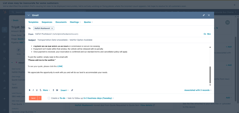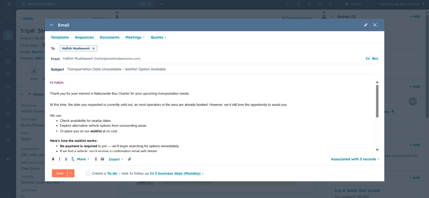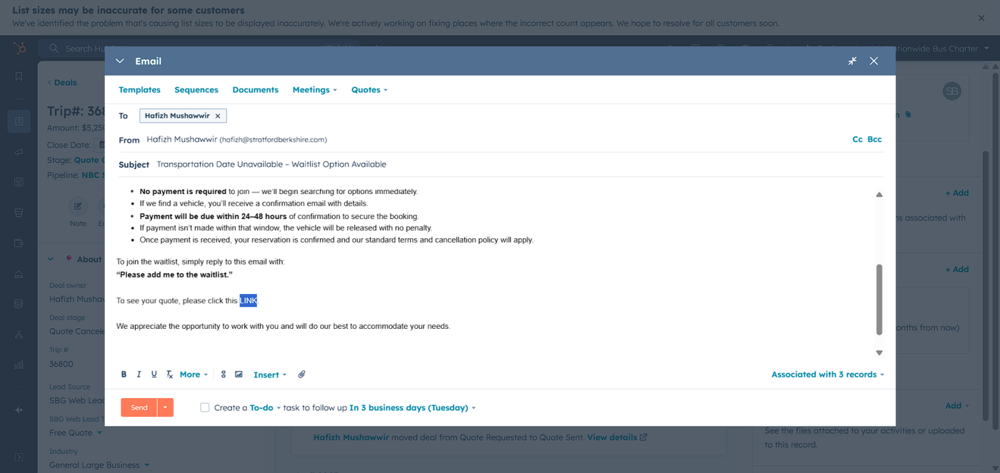 As of May 2025, Nationwide Bus Charter has launched a Waitlist option for customers. This option will allow the sales rep to provide a quote to their customer, even if the dates or bus options are sold out at the moment. The customer will have the option to join a waitlist, without any payment being made to towards the trip, giving the sales rep time to source a bus.