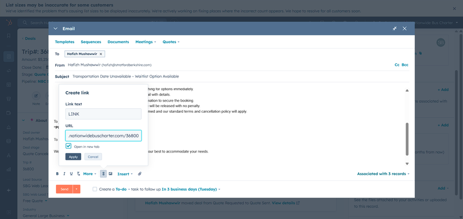You've now finished adding the hyperlink to the email for the customer to see the quote. Review your email again and click send.